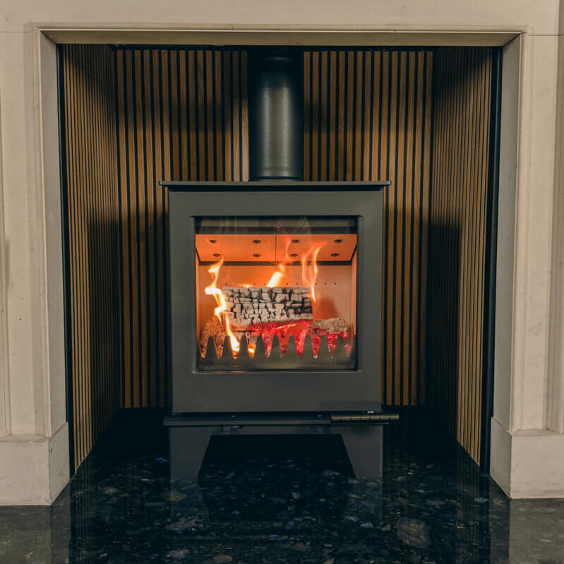 Clean lines, a robust steel body, and a cast-iron door make this stove a striking