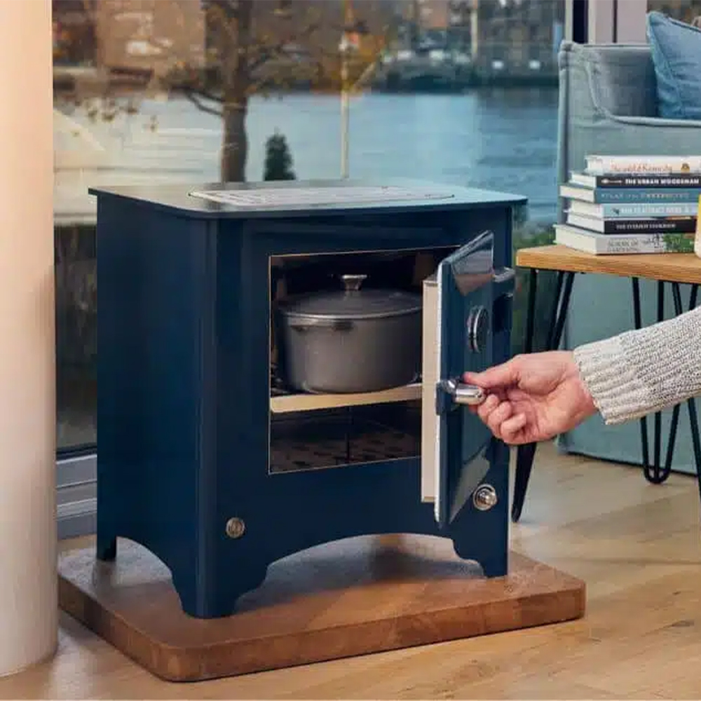 Our unique design concept* conceals a 20 litre oven behind the cast iron door reaching cooking temperatures of up to 200 degrees. Perfect for light meals, jacket potatoes, slow cooking and warming food through. Ideal for working from home without having to turn on the central heating or even leave the room for lunch! And a great idea for shepherd’s huts, holiday homes and motorhomes.